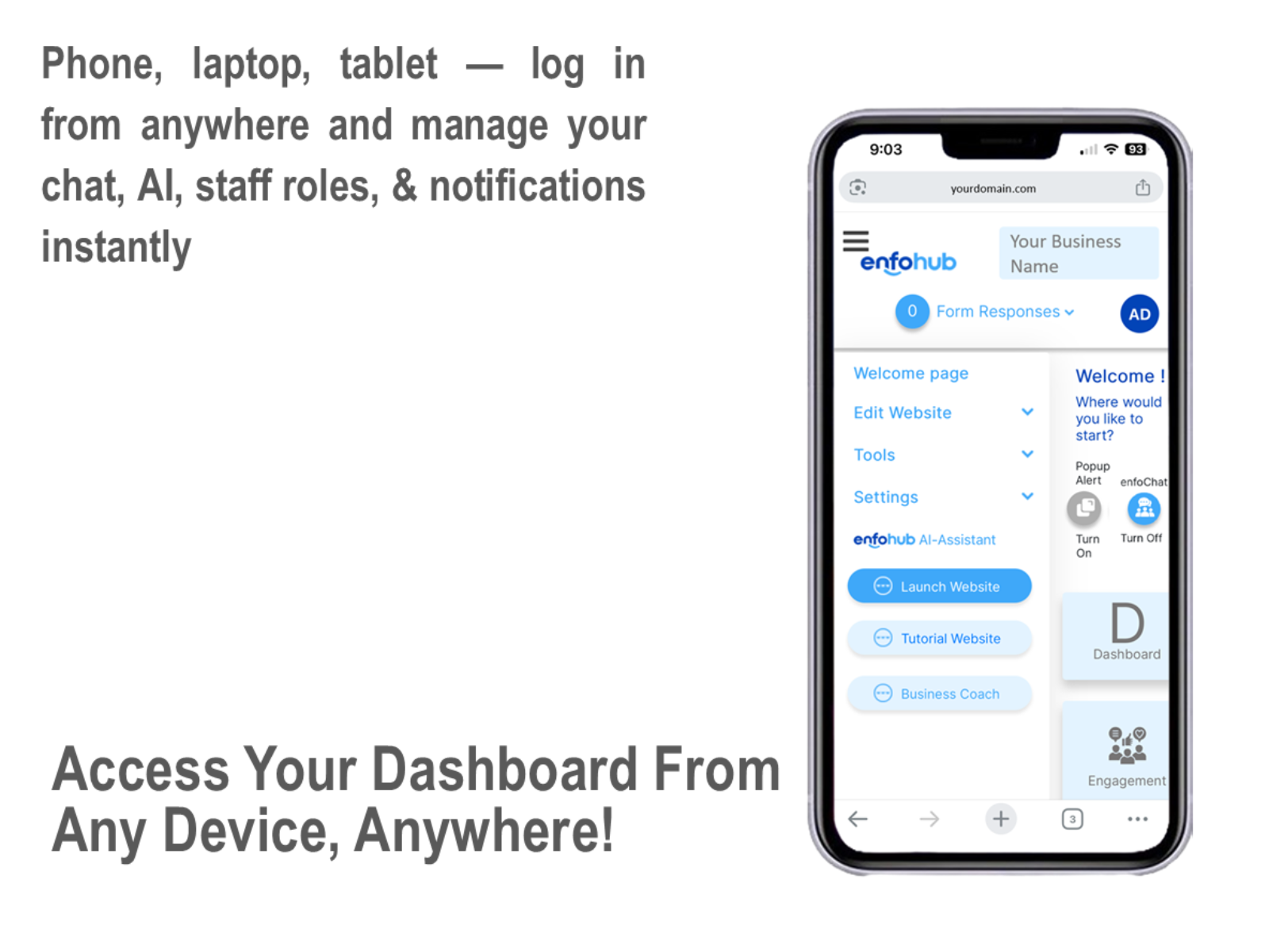 enfohub Website Builder : Crafted for small businesses with an easy-to-use platform and powerful business tools. New customers get a dedicated App Manager for personalized coaching on website use, marketing, and more. Our AI assistant helps small businesses thrive with tailored support. More than a website! Download our Free mobile App from your app store.